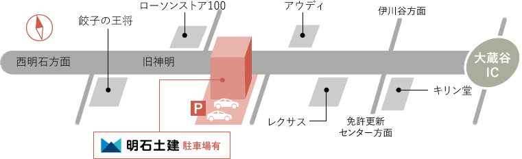 大蔵谷インターから西へ1.2km 約2分。 旧神明道路沿い南側。